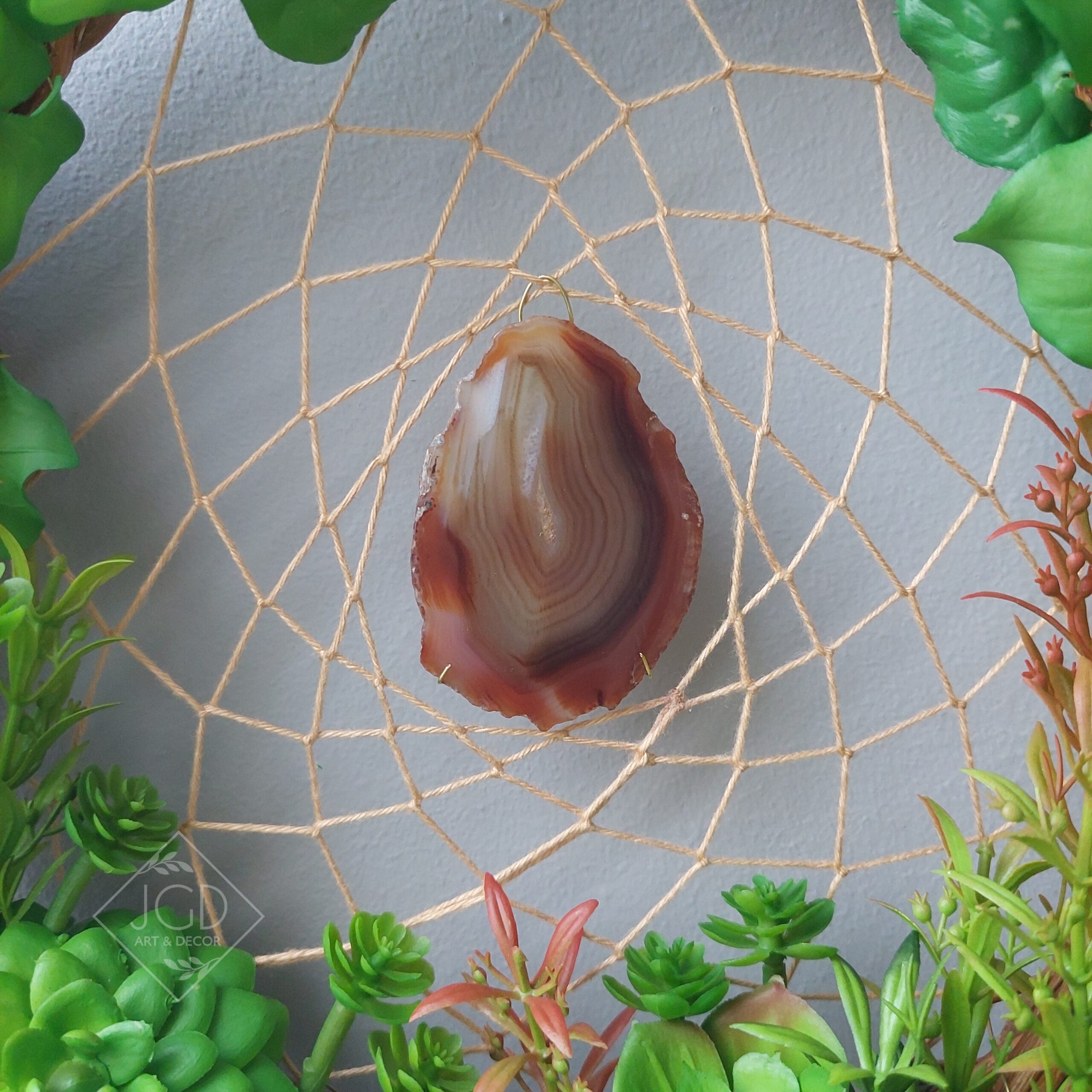 Ez a fali dísz egy különleges achát köré épül. Első pillantásra egy fatörzs szelet jutott róla eszembe, az évgyűrűk finom rajzolatával.