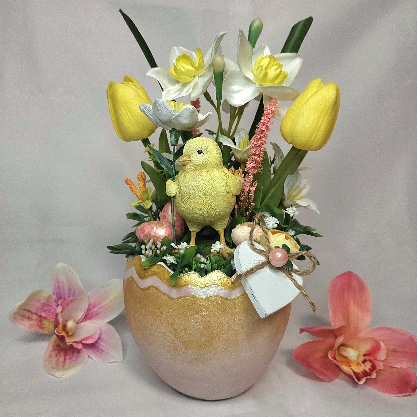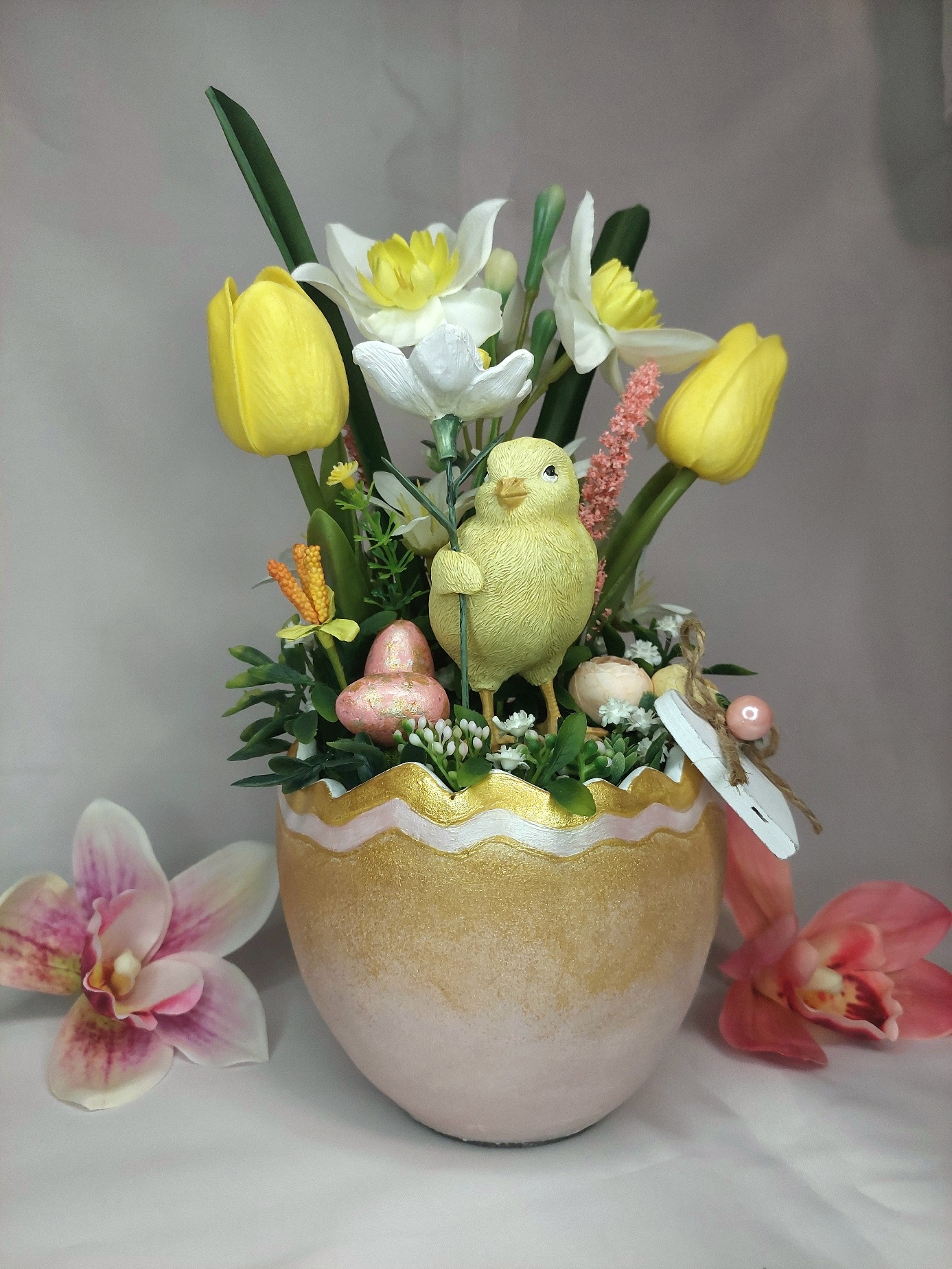 Az arany és rózsaszín gyöngyház festésű, tojás formájú kaspóban élethű tulipánok és nárciszok kaptak helyet.