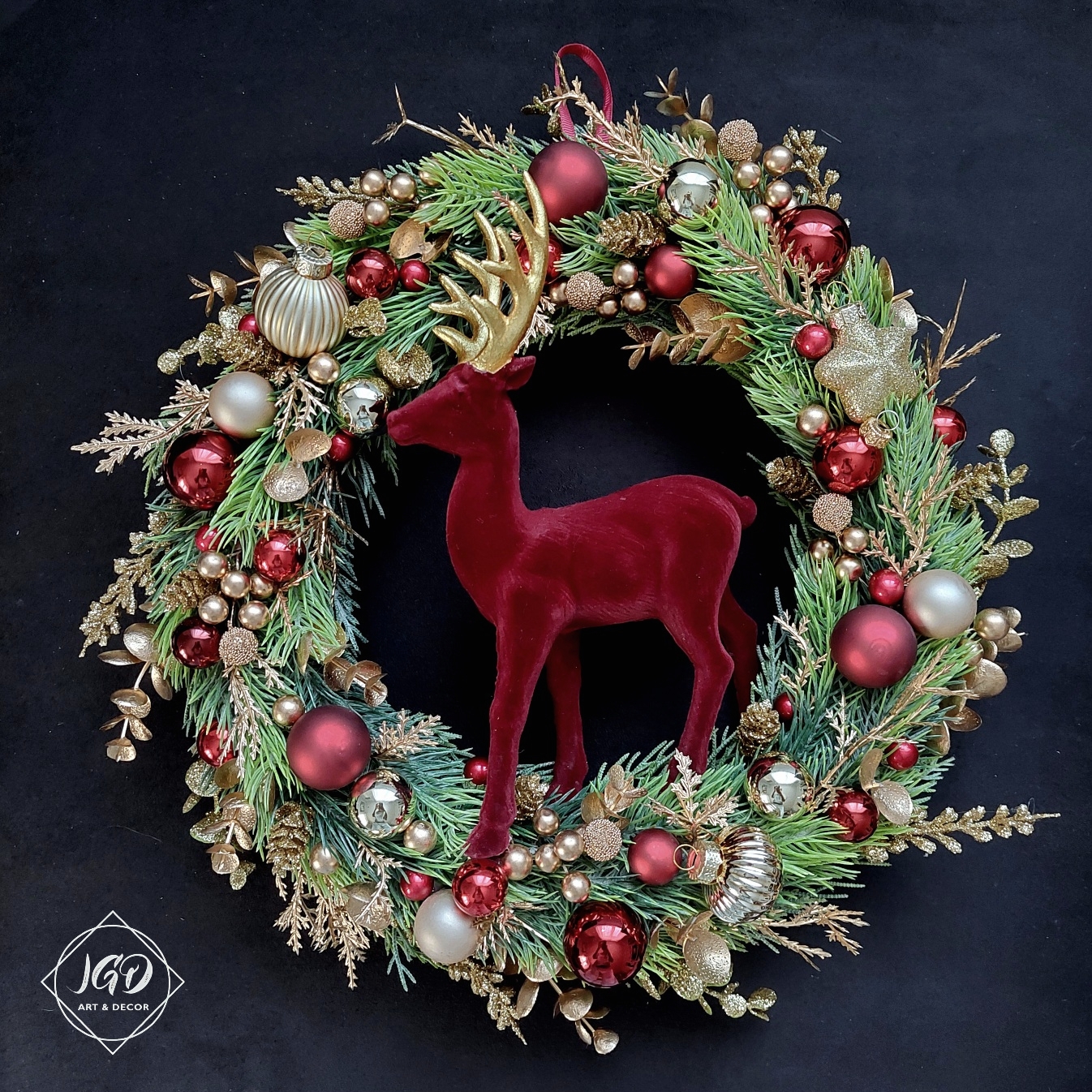 A puha bársony szarvas, a gazdagon díszített arany-bordó gömbök és az élethű fenyőágak természetes hatása együtt igazán meleg, meghitt karácsonyi hangulatot hoznak az otthonodba.